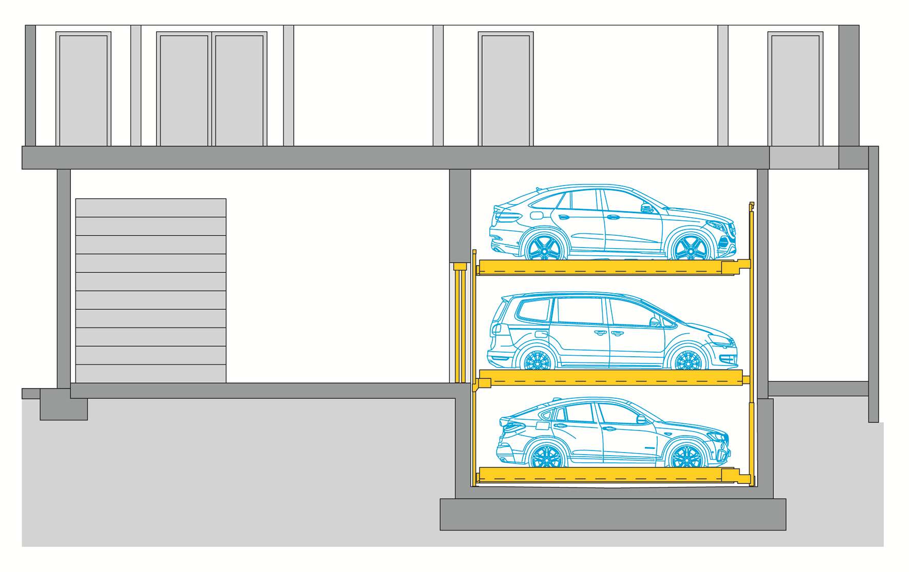 Der Combilift 543 ist ein halbautomatisches Parksystem. Das Grundprinzip des Combilift 543 ist, dass es eine Ebene in einer Grube, eine Ebene an der Fahrfläche und eine Ebene darüber gibt. 3 Ebenen und alle Fahrzeuge können einzeln angefahren werden, ohne dass ein Fahrzeug ausgeparkt werden muss. Durch das Verschieben der Parkplatten ist das Parken auf allen Stellplätzen völlig unabhängig möglich. Durch die breiten Plattformen (270 cm) ist das Ein- und Ausparken besonders komfortabel.