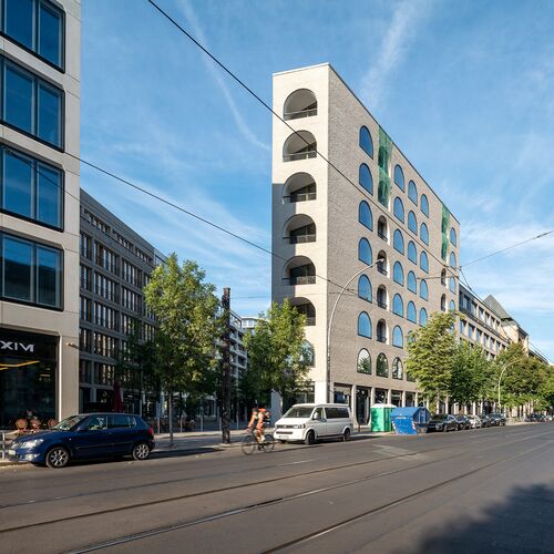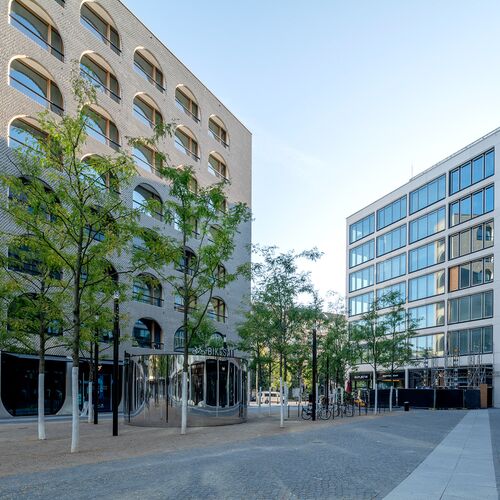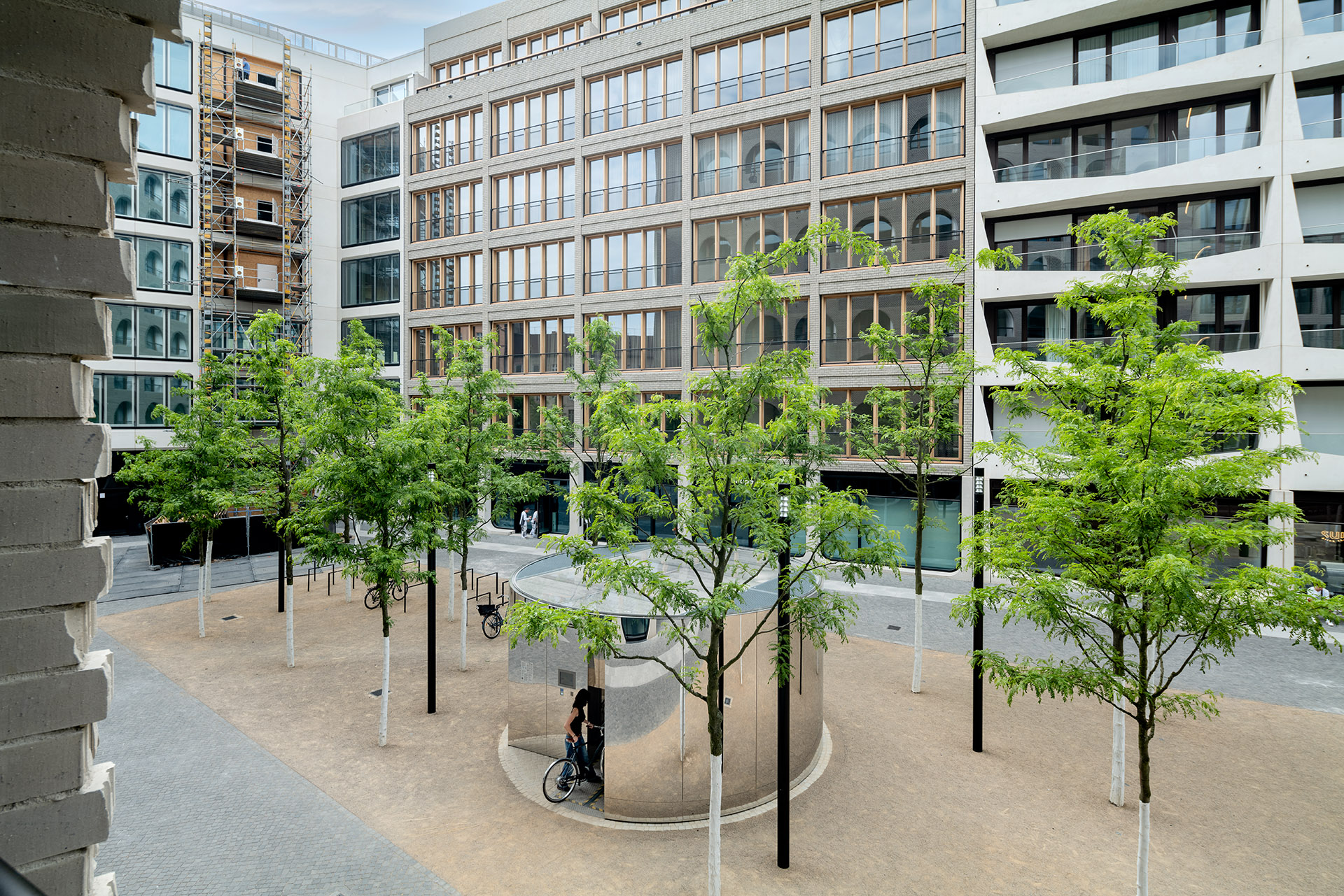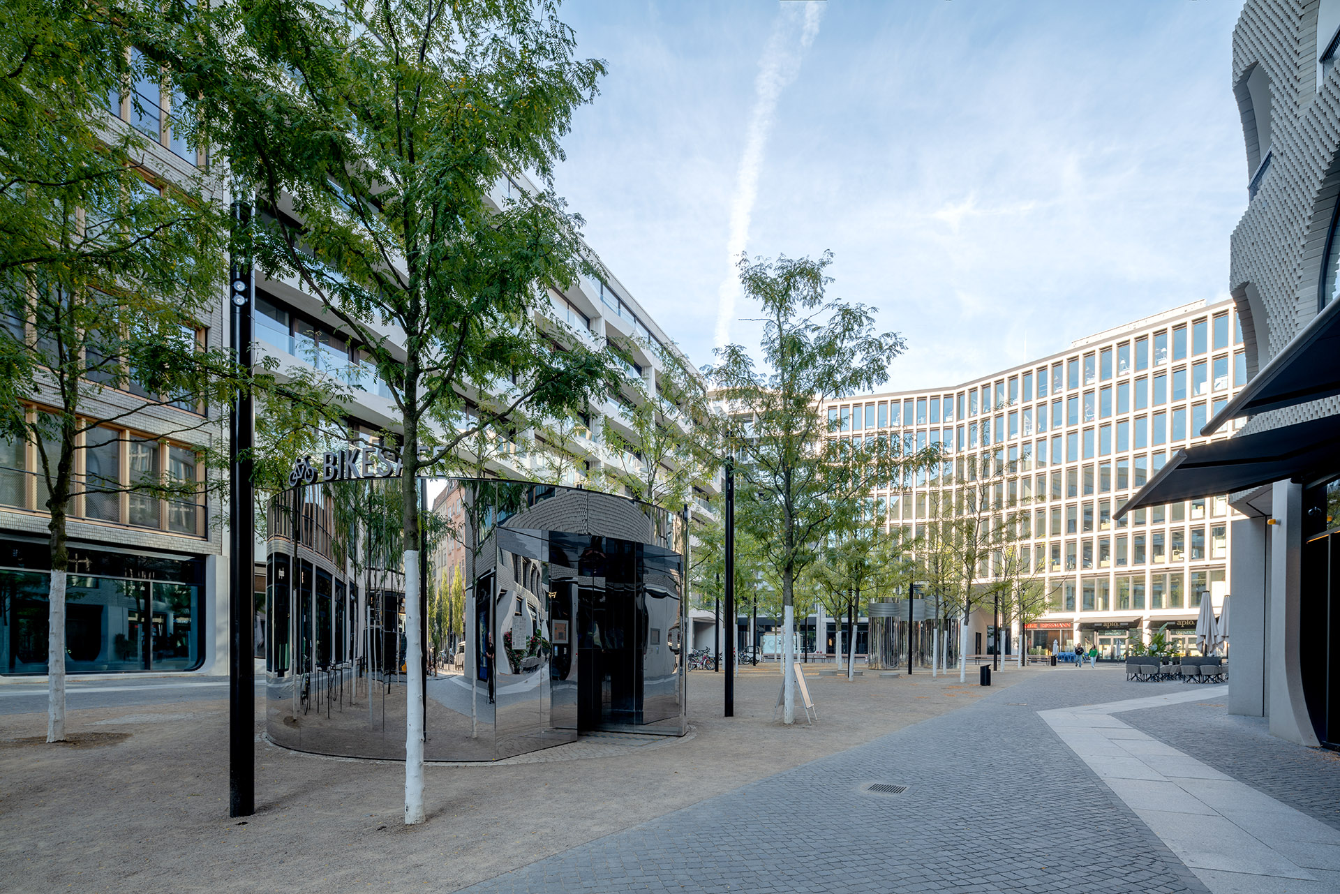 Compared to many new developments in Berlin, the space in the new AM TACHELES district has its own unique character thanks to its distinctive shape, open layout, facade design, and landscaping. The mirrored cylinder in the center that provides space for bicycles is a nice little highlight.