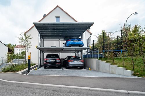 The inner courtyard of the townhouse has a WÖHR Parklift 461 D for four parking spaces on an area for only two parking spaces. With the parking lift range 461-463, the number of parking spaces is multiplied and at the same time offers the users convenient parking, which is extremely rare in Stuttgart city centre. When the double unit is lowered, two parking spaces including parked cars are hidden underground. The cover platform of the system continues to be available and provides two further parking spaces at street level. Another special feature is the fact that the cover platform can be occupied individually and perfectly adapted to the environment.