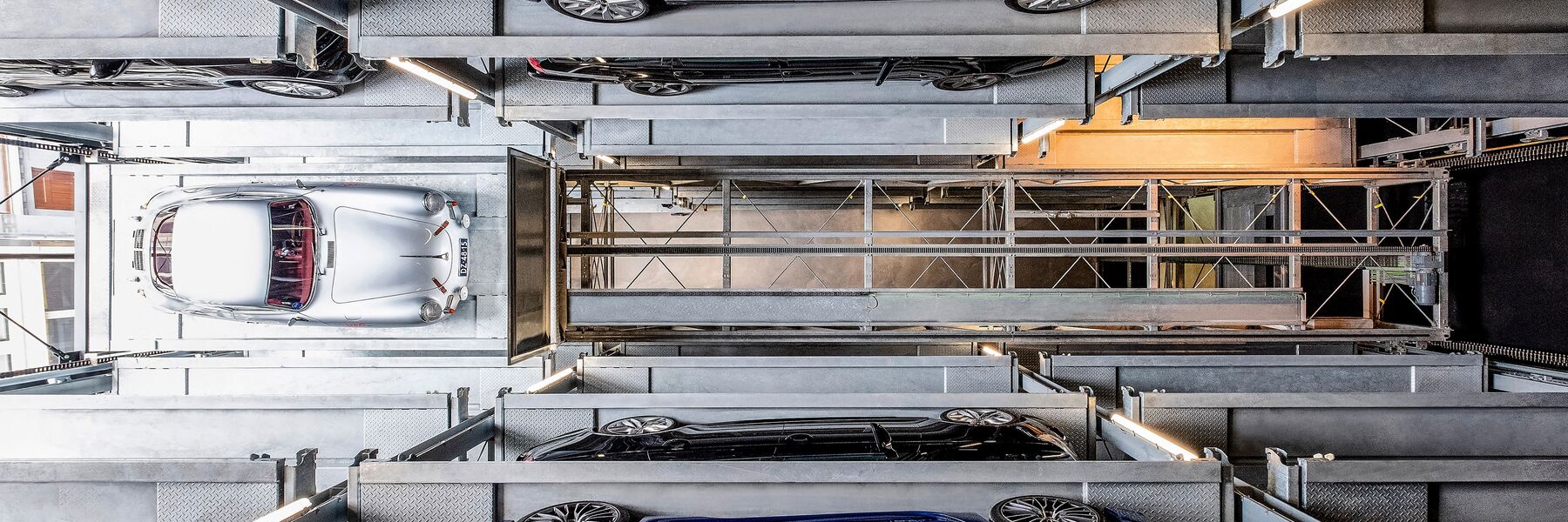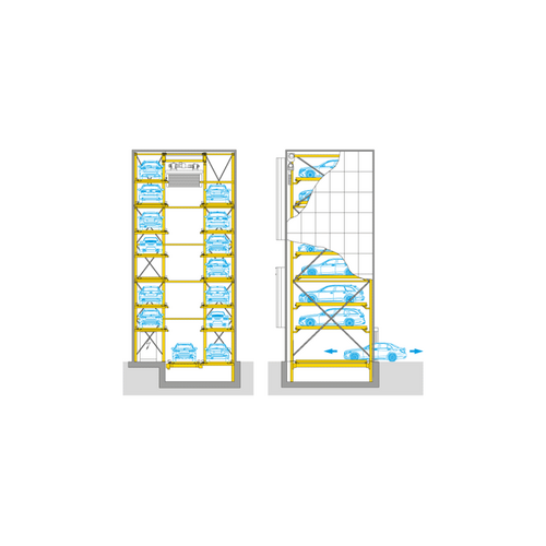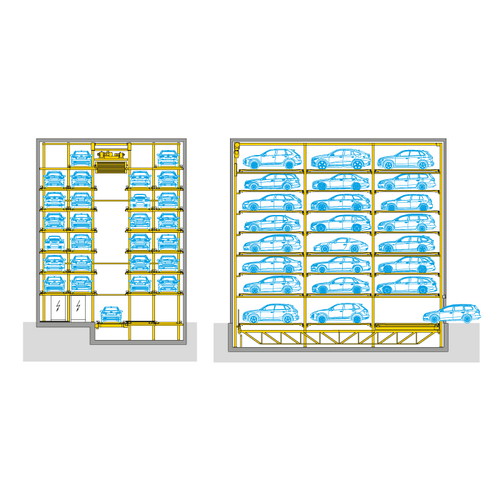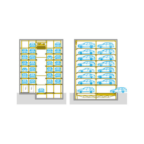 When parking system concepts shoot sky-high, then it will most likely be one of these automatically driven parking systems that come into play. Based on storage rack principles, the vehicles are parked into storage shelves positioned either rightwards or leftwards. This will result in a tower, a shaft or a tower/shaft combination – accurately customised to individual project requirements. The Parksafe models by WÖHR are equiped with a central vertical lift, which fullyautomatically transports the cars to the next free parking place and store safe from theft or vandalism.