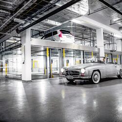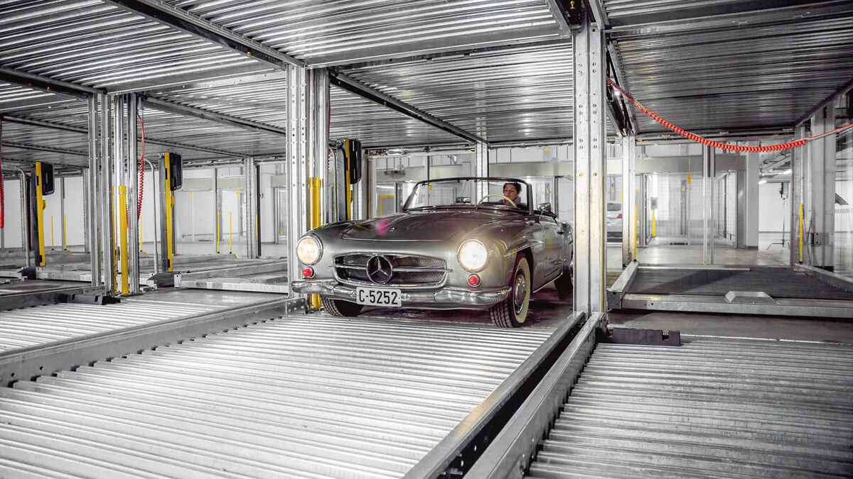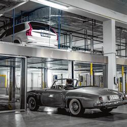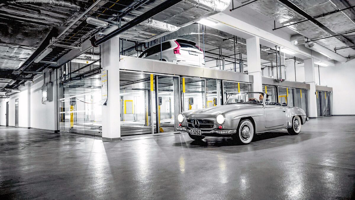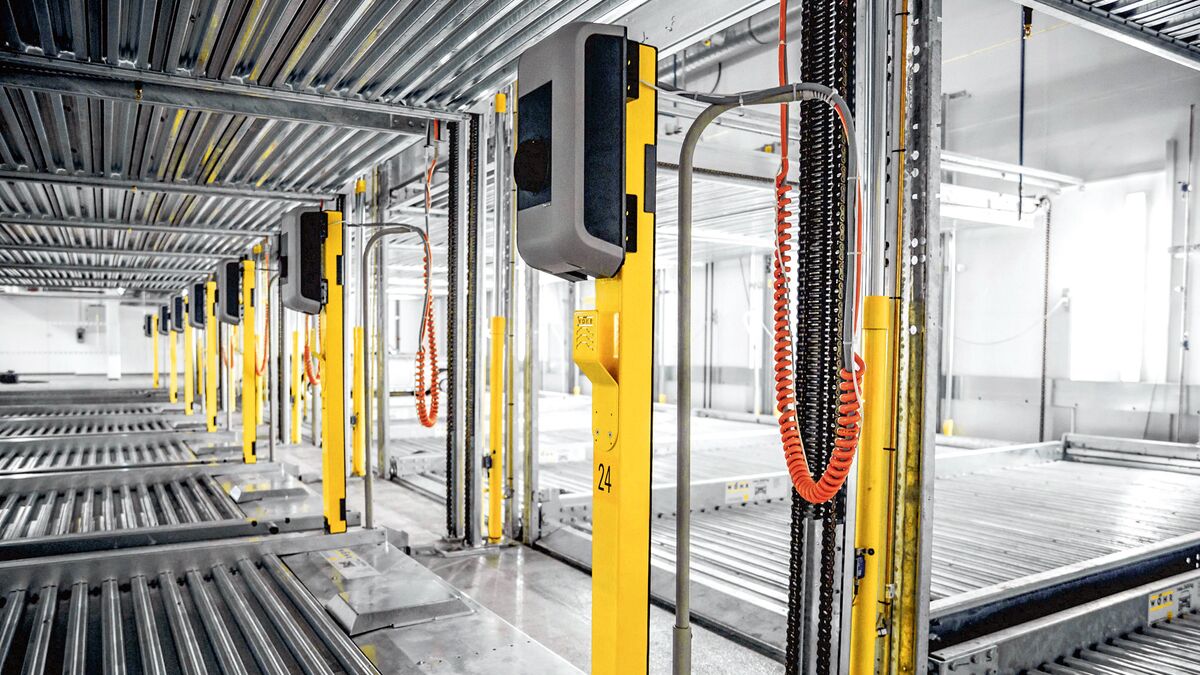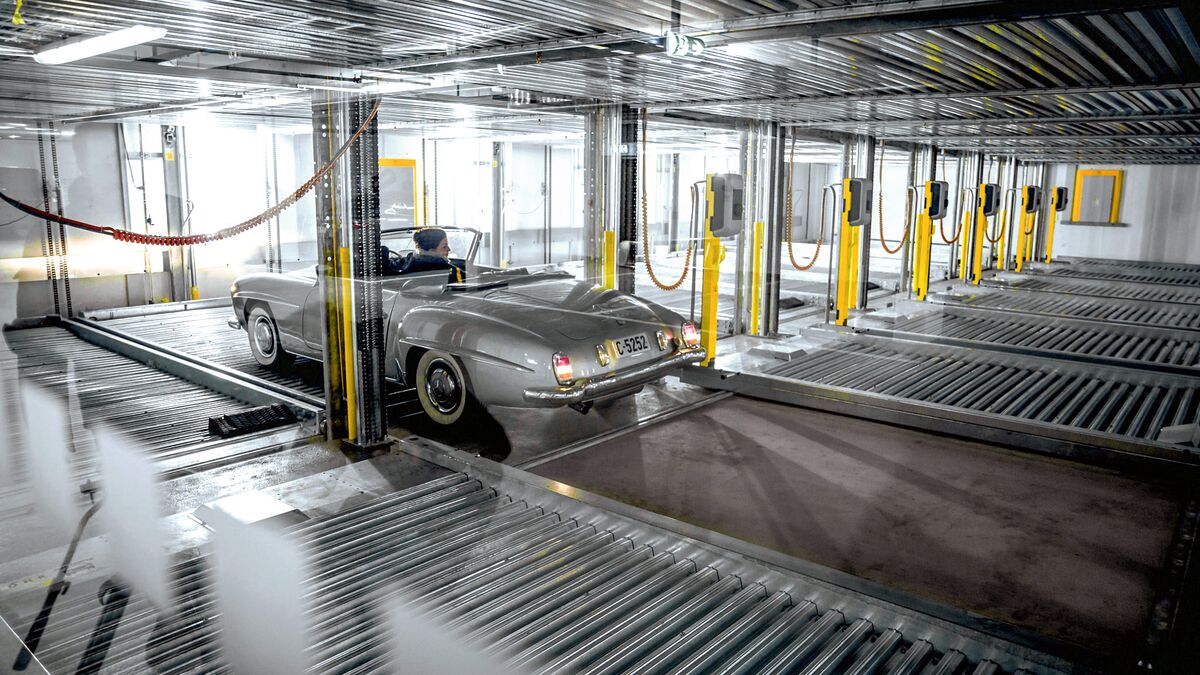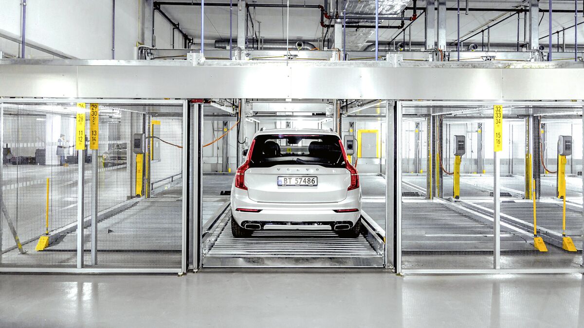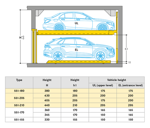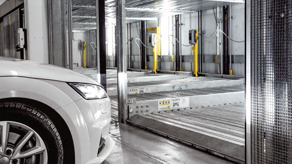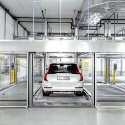 Combilift 551: independent parking in 2 levels above each other without pit. By lifting and sliding the platforms, direct access to all parking places at the entrance level.