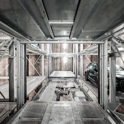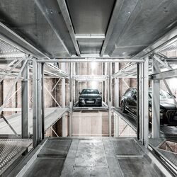 The Crossparker 558 offers an extension to the Slimparker 557 as far as width is concerned. Two further grids can be arranged on each side left and right next to the central lift. In this way, the amount of parking spaces can be as much as doubled on the available ground surface. This system also lowers the entrance to the ground level after use.