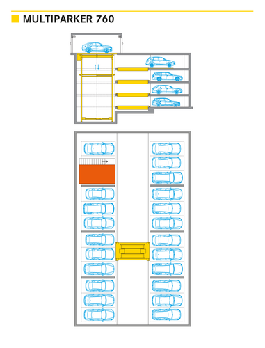 The Multiparker 760 is suitable for construction cubes similar to a high rack made out of concrete, as tower or pit version. When ever bigger floor plan areas are available but project configurations featuring less parking levels, nevertheless the Multiparker 760 captures several hundred parking places per level. At each level independently operating shuttles transfer and park the cars to concrete slab by way of the longitudinal pick-up transport system LAT. Short access and operation times are warranted.
