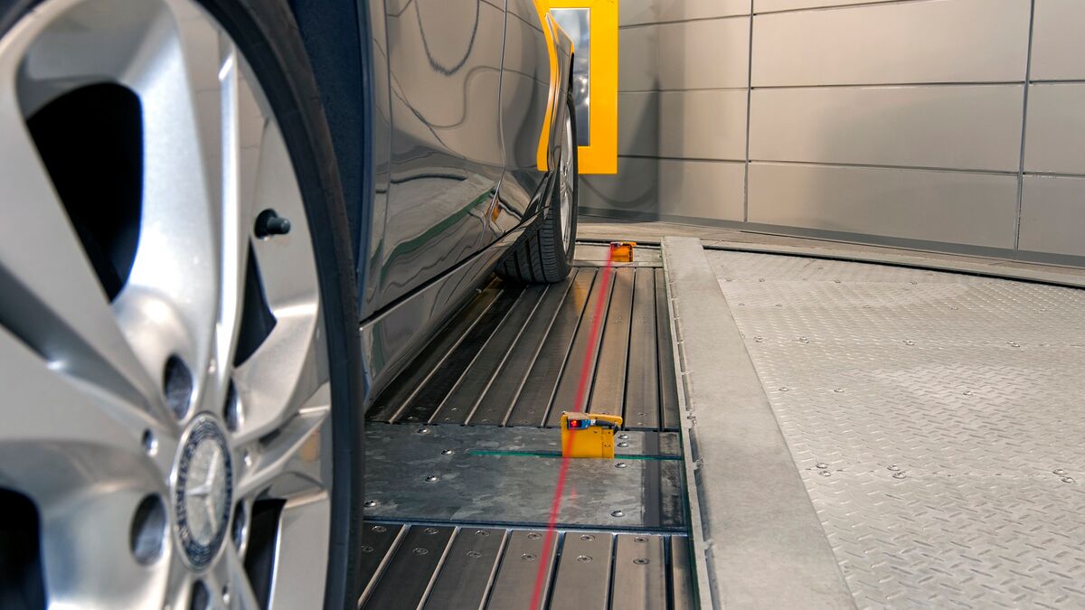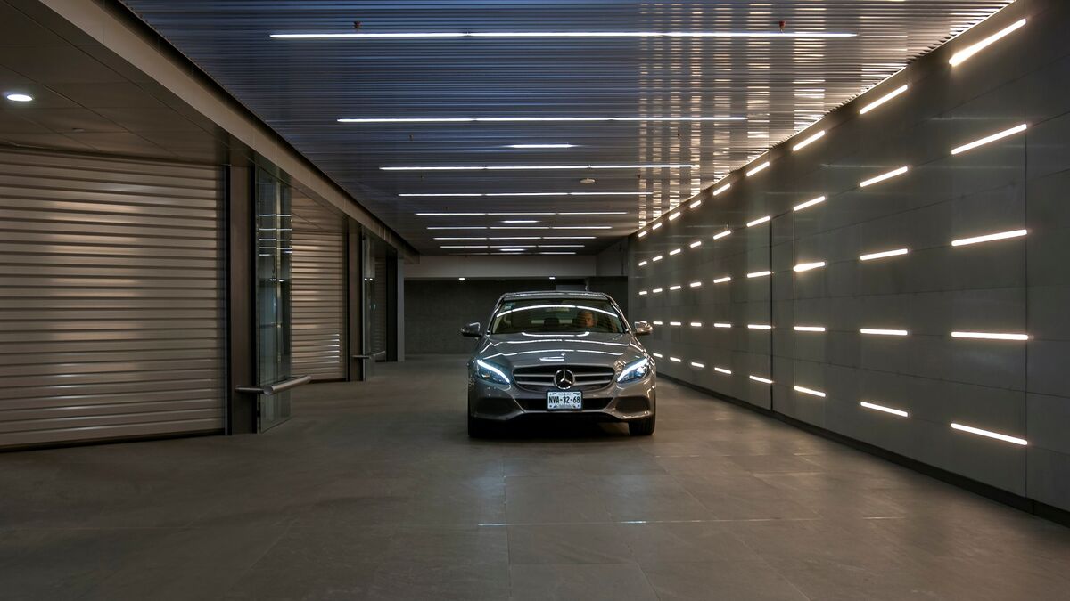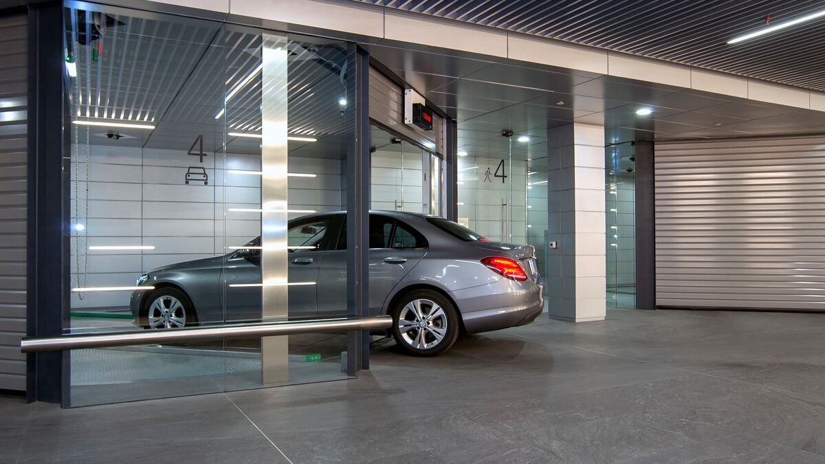 The WÖHR parking system is located underground. Users drive down by car via a ramp. The key fob with a built-in RFID chip is held against the lock post, after which a small screen displays the cabin number. The door of the cabin opens and the car can be slowly manoeuvred onto the parking space. Four so-called curtain lasers analyse whether the vehicle has been optimally placed or if slight corrections still have to be made. This is important for the fully automated system to work.