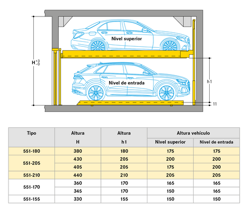 El Combilift 551 con 2 niveles, sin foso, para estacionamiento independiente de coches. El desplazamiento lateral y apilamiento, consiguen independencia con un solo lugar libre.