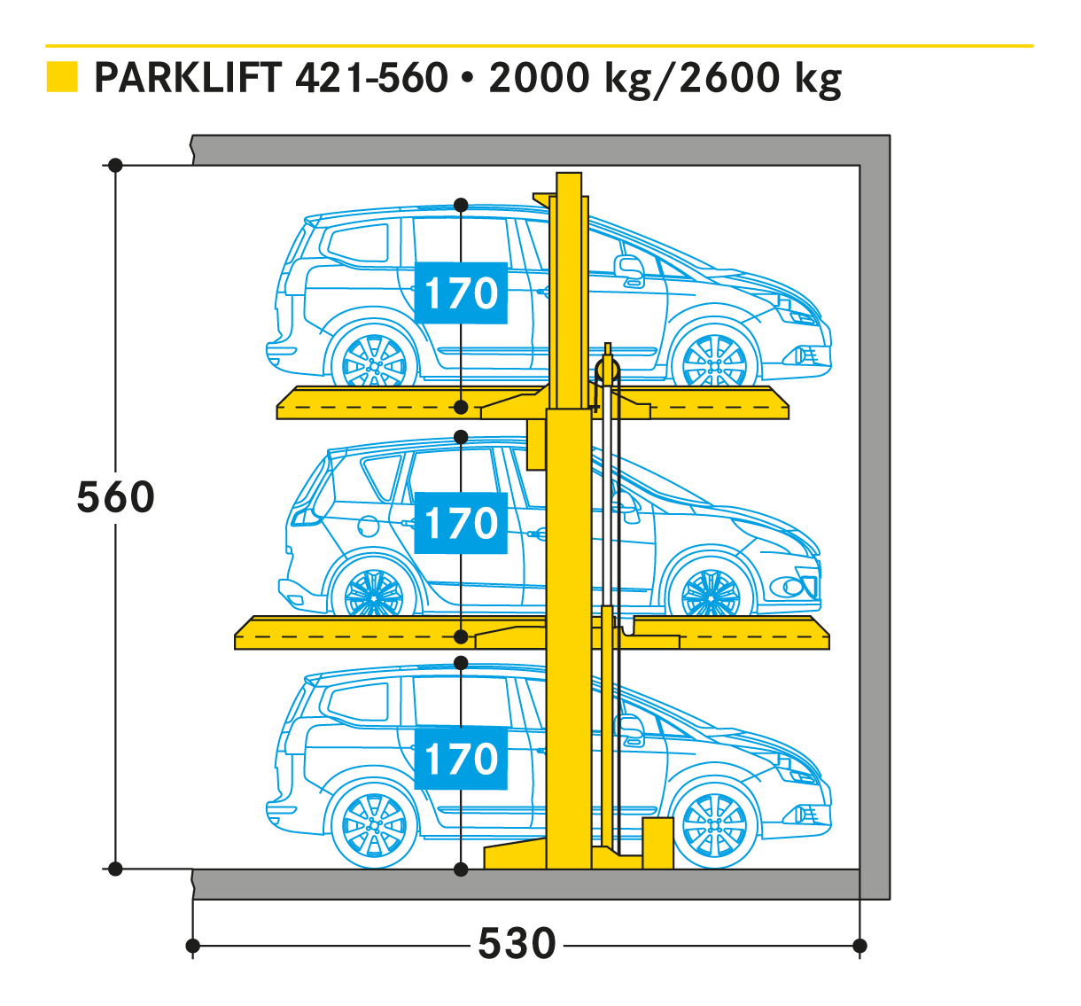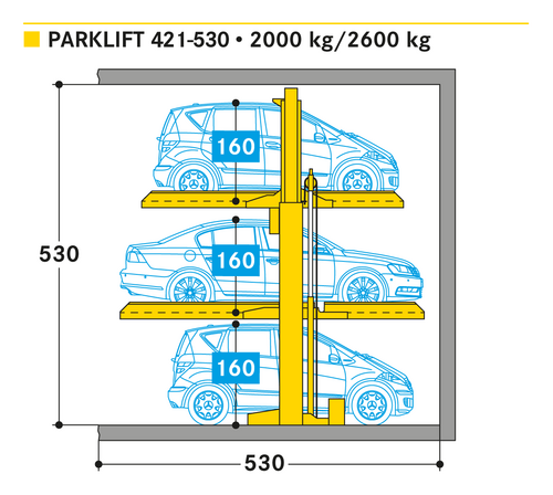 El Parklift 421 transforma una plaza de aparcamiento convencional en 3. Es una solución compacta siempre que se necesiten plazas adicionales de aparcamiento y los coches aparcados tengan espacio para maniobrar. El Parklift 421 tiene dos plataformas para estacionamiento dependiente entre usuarios. Primero se ocupa la plataforma superior, después la plataforma inferior y finalmente, una vez que ambas plataformas han sido elevadas, un tercer coche se puede estacionar sobre la losa de piso por debajo las plataformas. Para una gama más amplia de opciones, varios sistemas pueden instalarse uno al lado del otro o en filas uno detrás del otro o incluso al aire libre. Unidades sencillas para 3 coches.