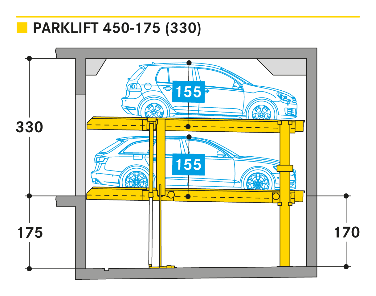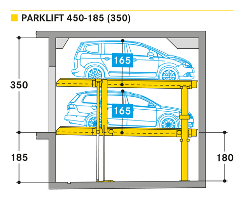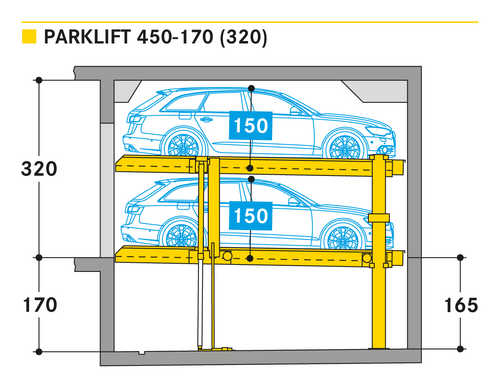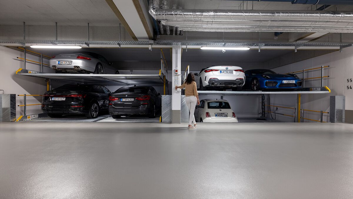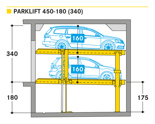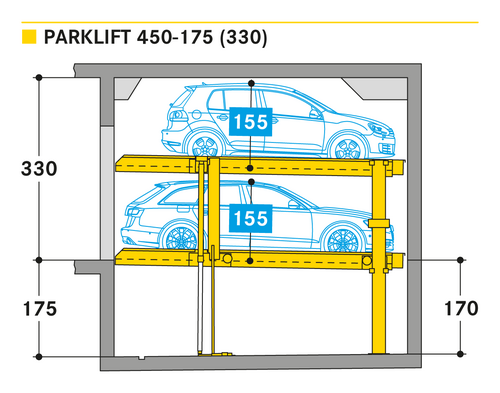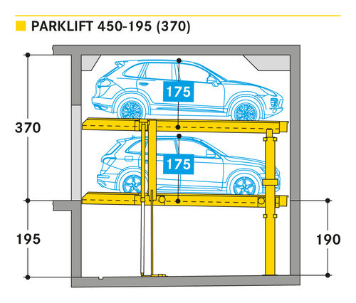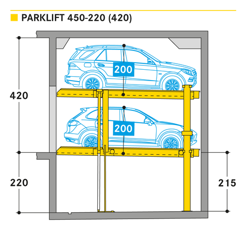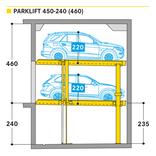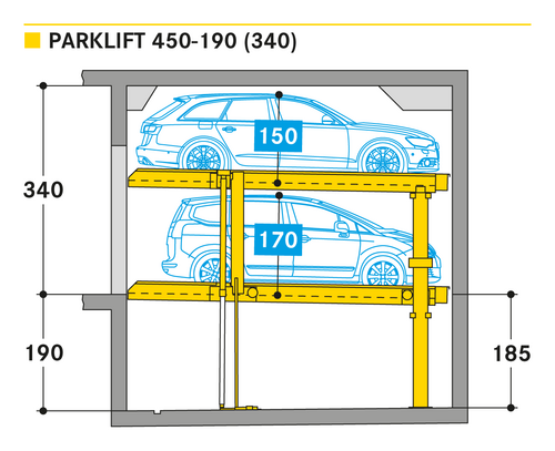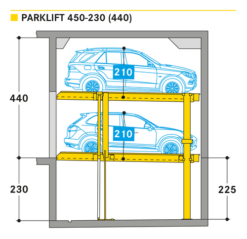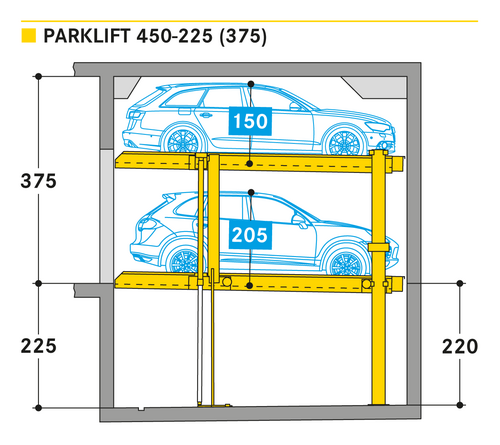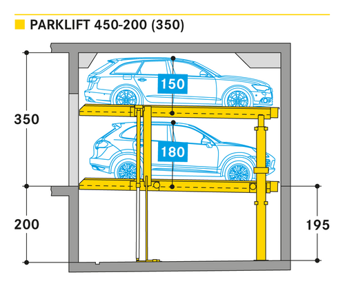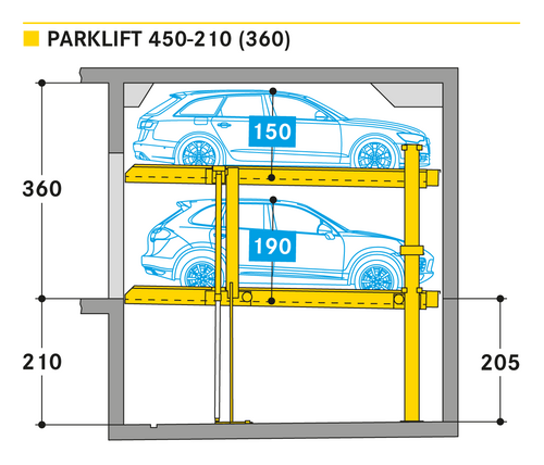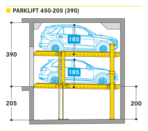 El Parklift 450 ofrece una alta flexibilidad en las medidas de montaje. Se acabaron los tramos obligatorios de 15 cm establecidos en las profundidades de foso. En el nuevo sistema, los tramos de altura libres son de 5 cm. En comparación con el modelo anterior, el Parklift 450 necesita 5 cm menos de altura del techo, sin reducir las alturas para los coches. ¿Cómo funciona? En el modelo predecesor, para permitir el desagüe del agua lluvia de las plazas de aparcamiento, era necesaria una plataforma elevada a través de la que podía fluir el agua hacia canal de desagüe. La nueva versión prescinde de la elevación y soluciona el desagüe de la plataforma con una inclinación mínima de la misma del 2%. El sistema simple es para 2 coches y el sistema doble para 4 coches.