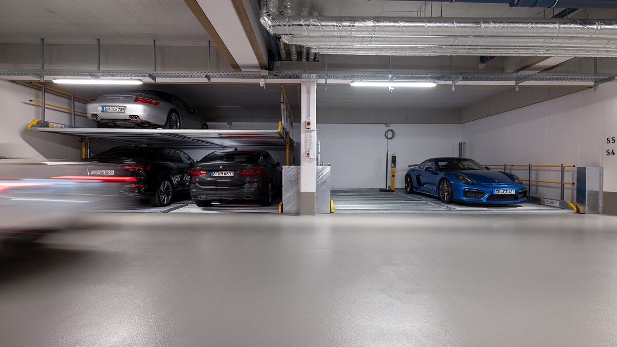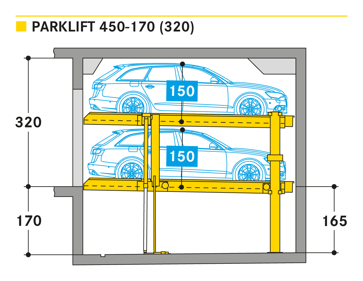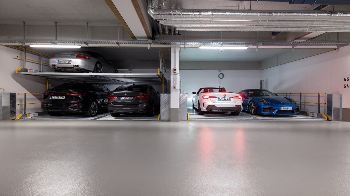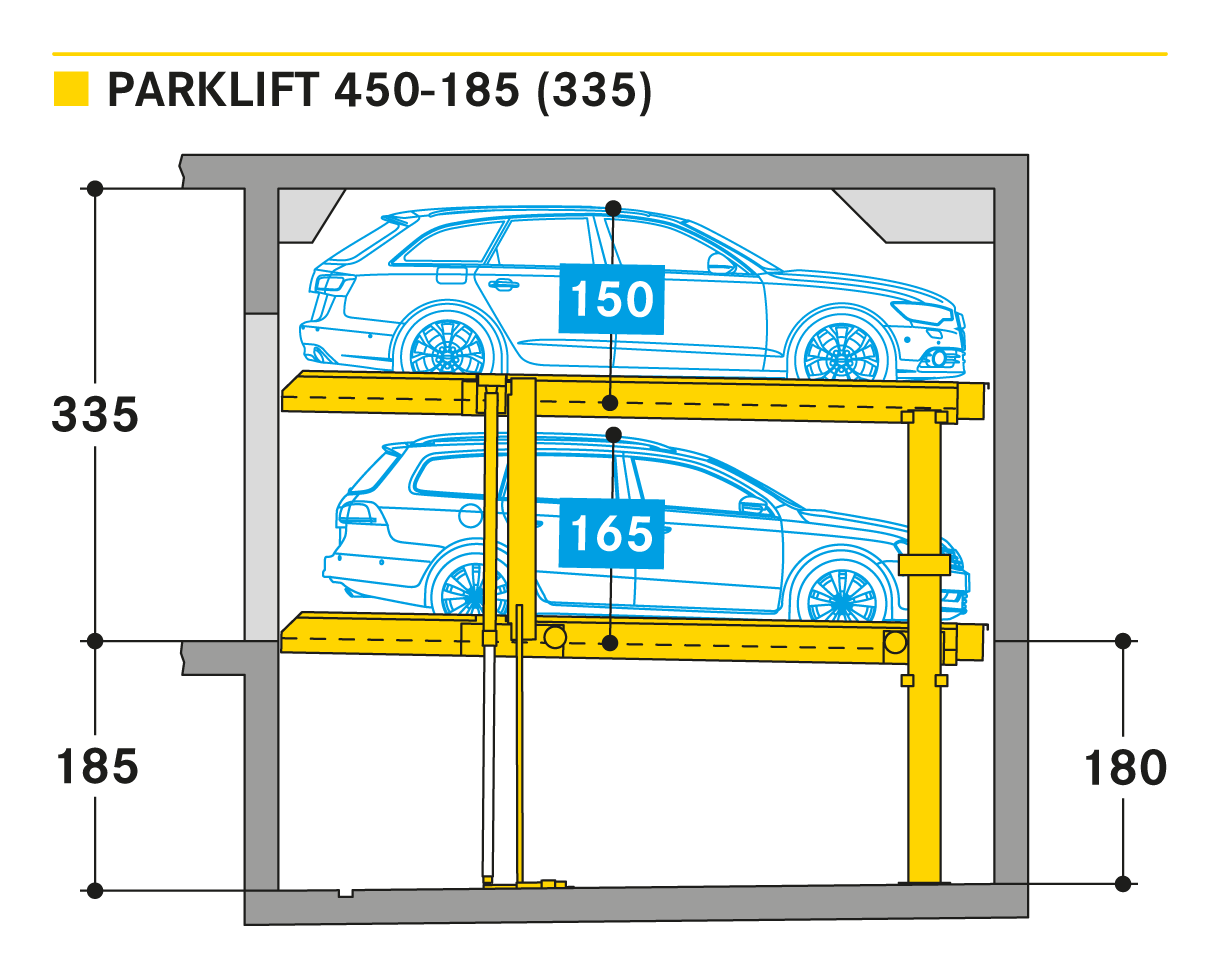 El Parklift 450 ofrece una alta flexibilidad en las medidas de montaje. Se acabaron los tramos obligatorios de 15 cm establecidos en las profundidades de foso. En el nuevo sistema, los tramos de altura libres son de 5 cm. En comparación con el modelo anterior, el Parklift 450 necesita 5 cm menos de altura del techo, sin reducir las alturas para los coches. ¿Cómo funciona? En el modelo predecesor, para permitir el desagüe del agua lluvia de las plazas de aparcamiento, era necesaria una plataforma elevada a través de la que podía fluir el agua hacia canal de desagüe. La nueva versión prescinde de la elevación y soluciona el desagüe de la plataforma con una inclinación mínima de la misma del 2%. El sistema simple es para 2 coches y el sistema doble para 4 coches.