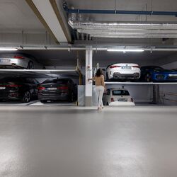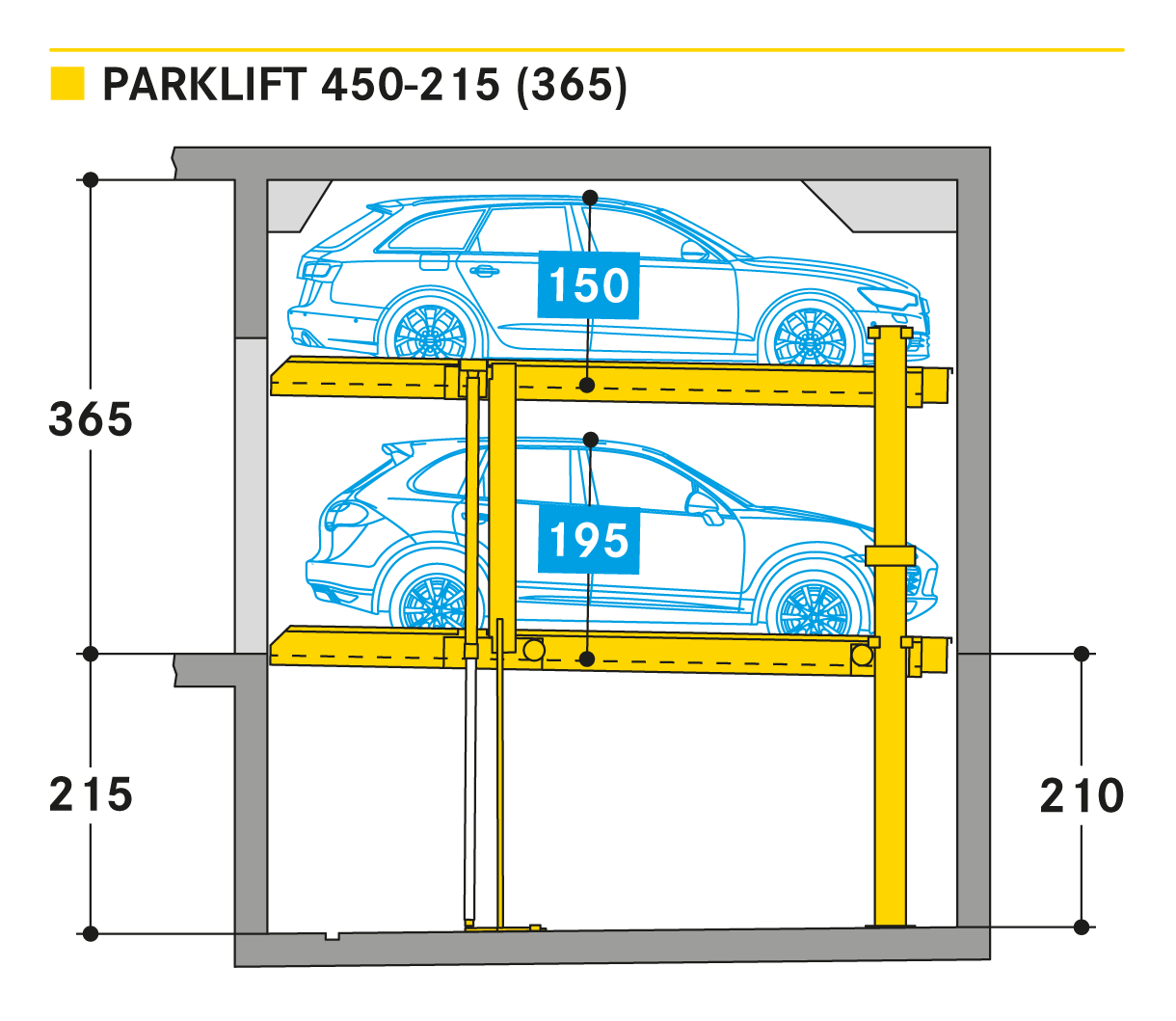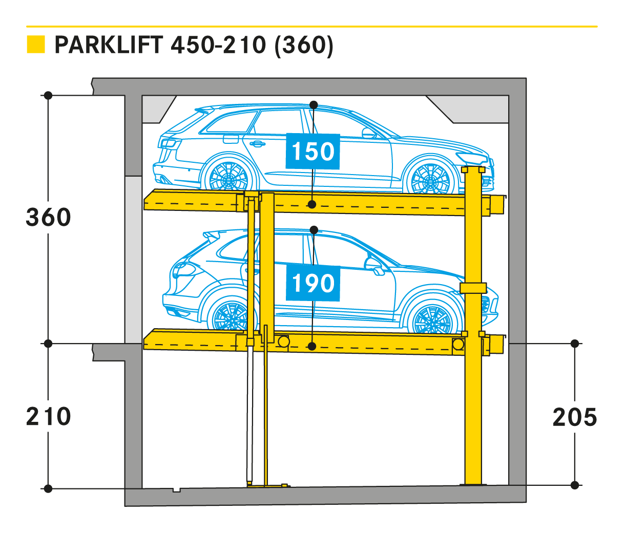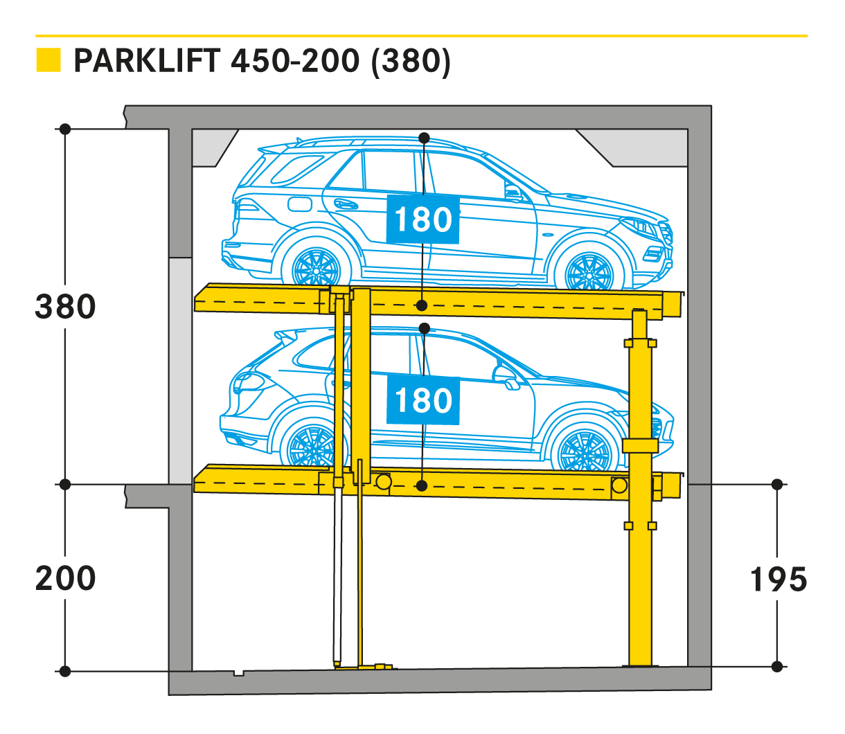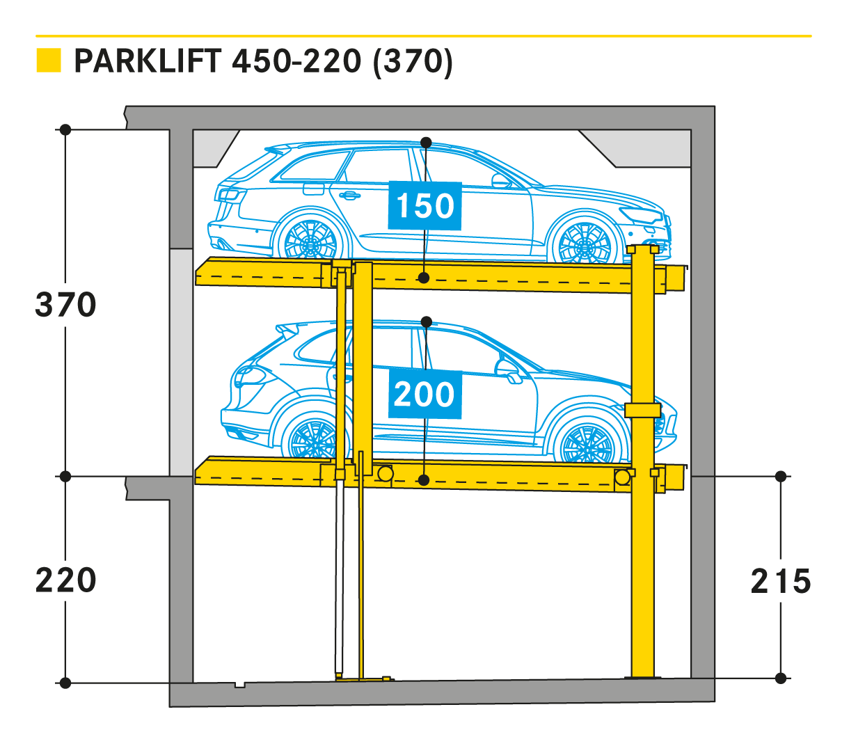 El Parklift 450 ofrece una alta flexibilidad en las medidas de montaje. Se acabaron los tramos obligatorios de 15 cm establecidos en las profundidades de foso. En el nuevo sistema, los tramos de altura libres son de 5 cm. En comparación con el modelo anterior, el Parklift 450 necesita 5 cm menos de altura del techo, sin reducir las alturas para los coches. ¿Cómo funciona? En el modelo predecesor, para permitir el desagüe del agua lluvia de las plazas de aparcamiento, era necesaria una plataforma elevada a través de la que podía fluir el agua hacia canal de desagüe. La nueva versión prescinde de la elevación y soluciona el desagüe de la plataforma con una inclinación mínima de la misma del 2%. El sistema simple es para 2 coches y el sistema doble para 4 coches.