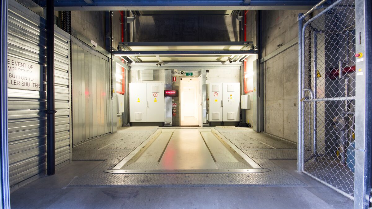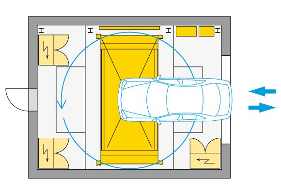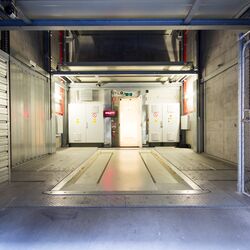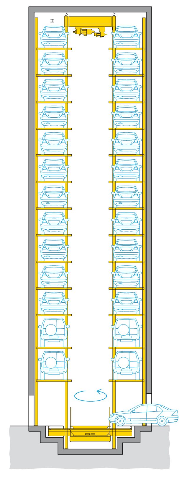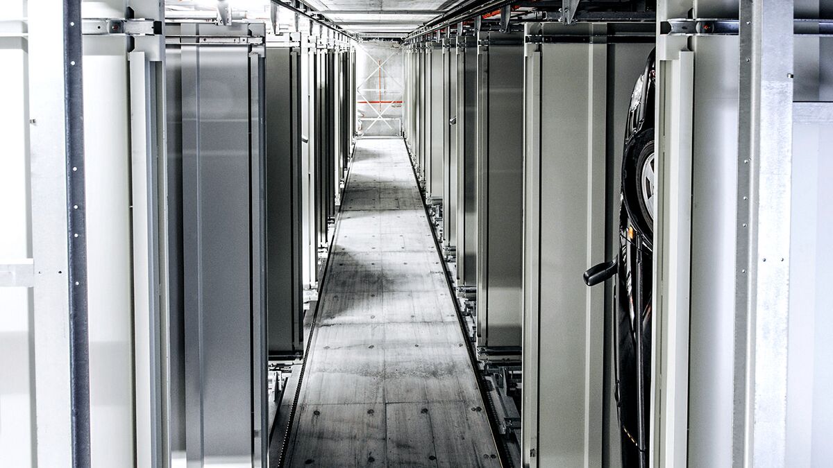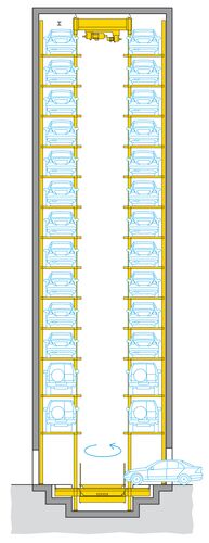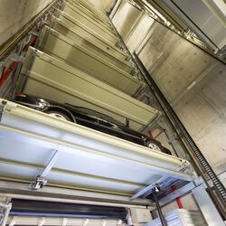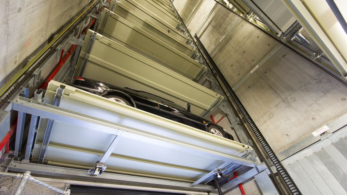 El sistema Parksafe 580 de WÖHR, en este caso tan especial, fue la solución ideal, debido al reducido espacio en planta que necesita. En una huella de tan sólo 7,30 x 5,80 m (la repercusión por plaza de aparcamiento es tan solo de 1,6 m²) se crearon 26 plazas de aparcamiento sobre rasante. Un elevador vertical central gestiona los vehículos ubicados sobre plataformas desde la cabina hasta uno de los 13 niveles de estacionamiento.