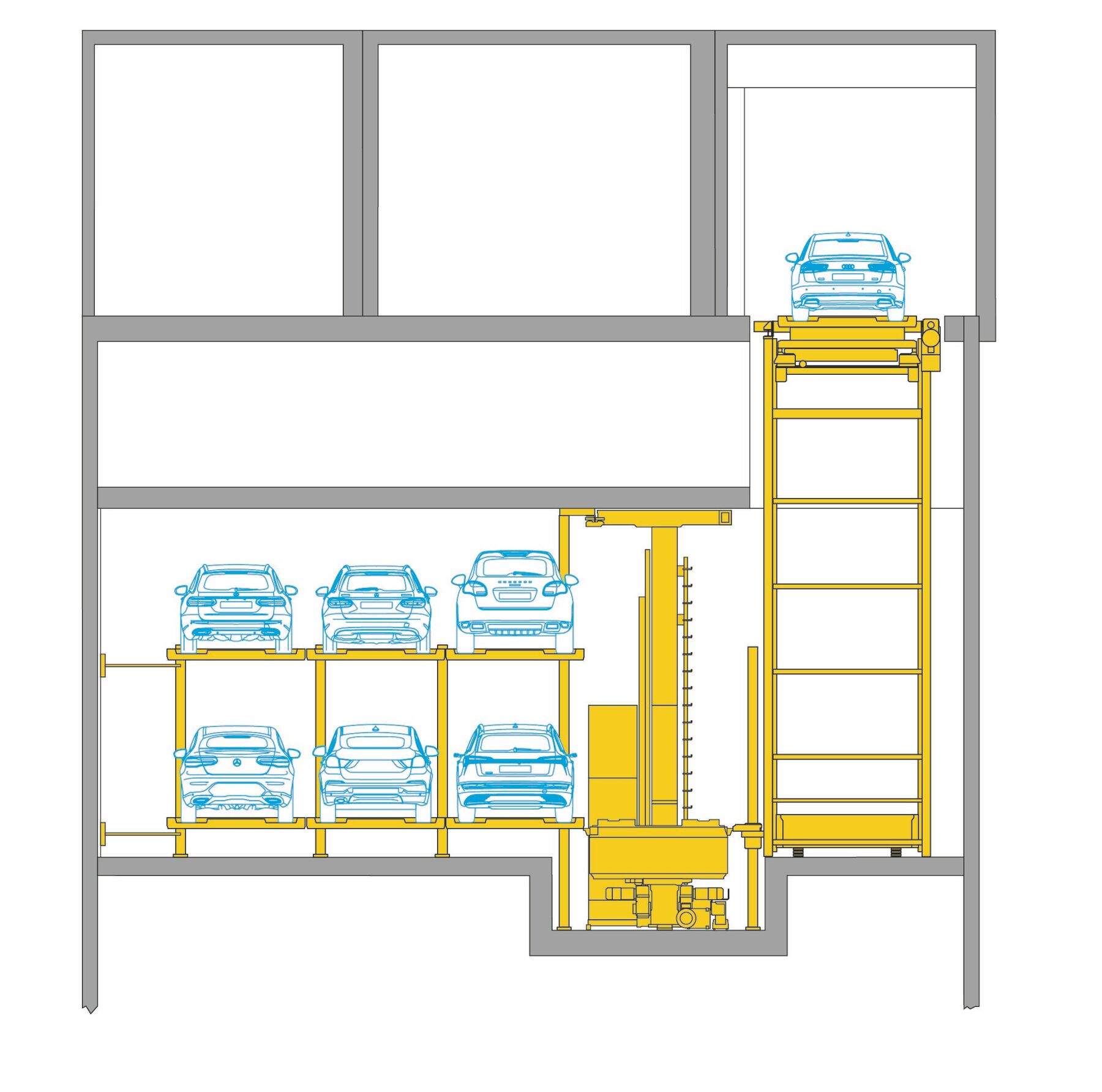 - 2 niveaux de parking avec 4 rangées de parking chacun