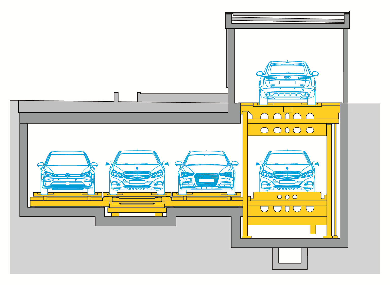 Le Corridor Parker 570 s'adapte ainsi aux besoins individuels. Le dispositif de rotation installé fait tourner les voitures à l'intérieur du système et les rend disponibles pour le stationnement dans le sens de la marche. Cela offre un confort de stationnement maximal, en particulier dans les passages étroits du projet. Des véhicules pesant jusqu'à 2,5 tonnes et d'une hauteur maximale de 2,0 m peuvent être garés.